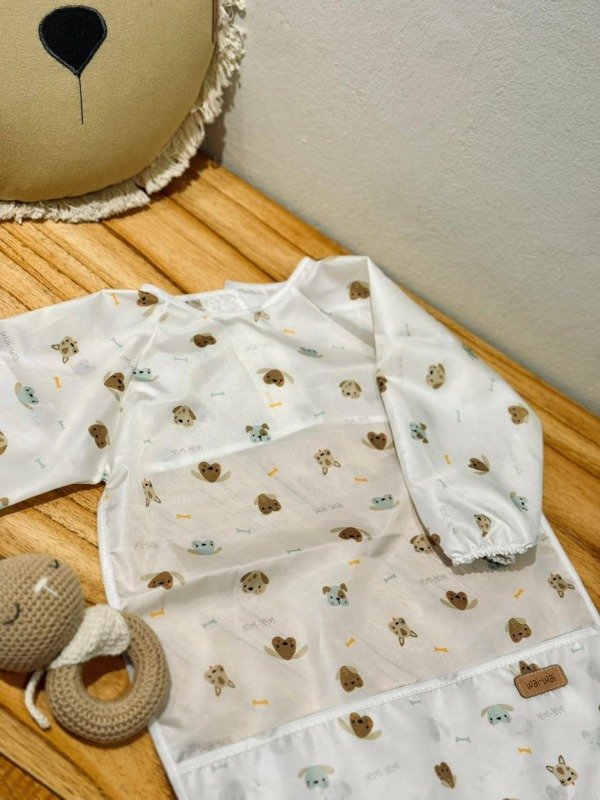 Tiene mangas largas con puños elásticos que protegen la ropa. Bolsillo atrapa migas recoge la comida que pueda caer.