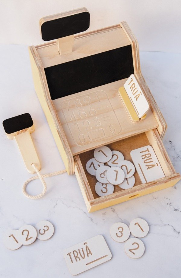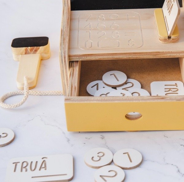 Caja registradora de madera, incluye monedas y tarjeta de credito